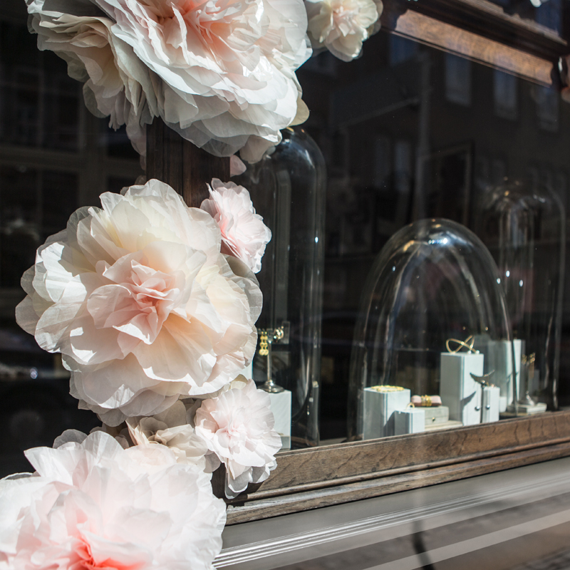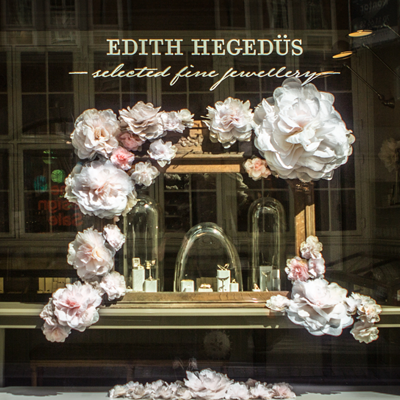 Vindues udsmykning og iscenesættelse er meget vigtigt for mig og en stor del af min butik. At udstille smykkerne på en smuk, usædvanlig og overraskende måde er lige så vigtigt som selve smykkerne.